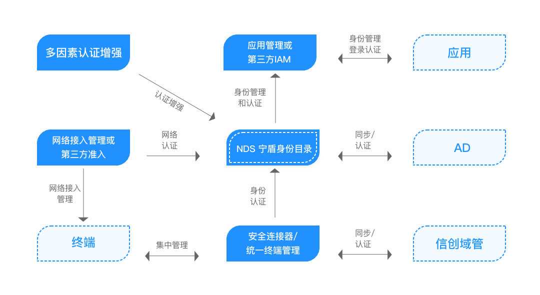 宁盾目录服务(Nington Directory Service,NDS)是基于标准LDAP协议自主研发的国产LDAP身份目录服务,用来存储用户身份数据,并提供统一的目录用户认证,可广泛应用于本地/云应用、操作系统、网络/安全设备场景。