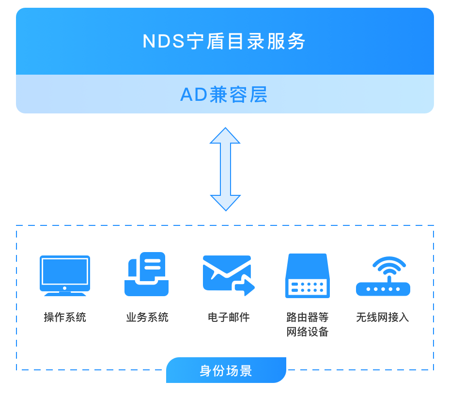 宁盾目录服务主要包含身份目录和各业务场景对接能力。身份目录具有和AD高度兼容的数据结构,降低了应用的变更代价,为应用迁移提供了便利。