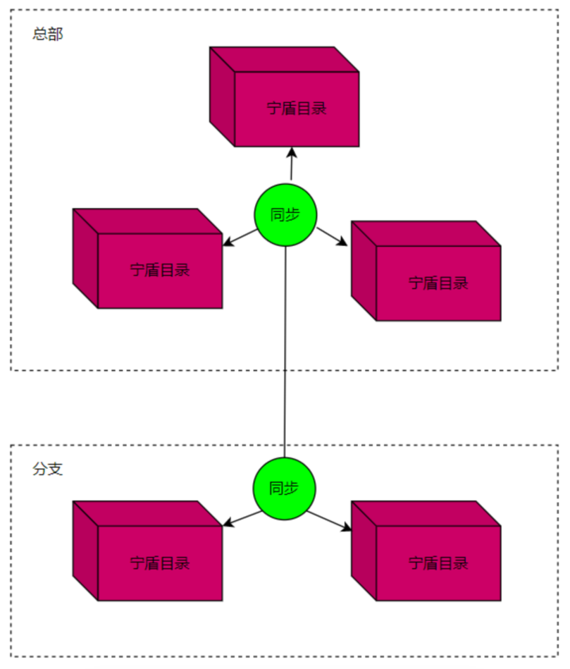 分布式部署模式下,每个物理分支都可以有多个宁盾目录实例。实例之间互相同步,物理分支之间互相同步。