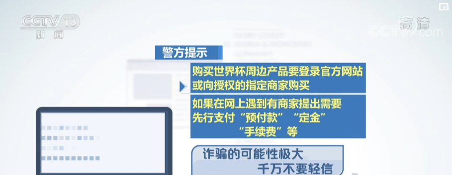 警方提示:购买世界杯周边产品要登录官方网站或向授权的指定商家购买,如果在网上遇到有商家提出需要先行支付“预付款”“定金”“手续费”等,诈骗的可能性极大,千万不要轻信。