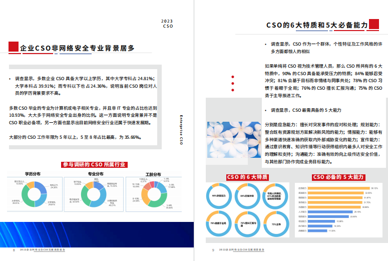 CSO作为一个群体,个性特征及工作风格的许多方面都惊人的相似。如果单纯将CSO视为技术管理人员,那么CSO所共有的6大特质中,90%的CSO具备能承受压力的特质;84%能够忍受冲突;81%会基于目标而非情绪与同事共处;78%的CSO习惯于着眼于全局;76%的CSO擅长汇报沟通;75%的CSO勇于主导推进工作。