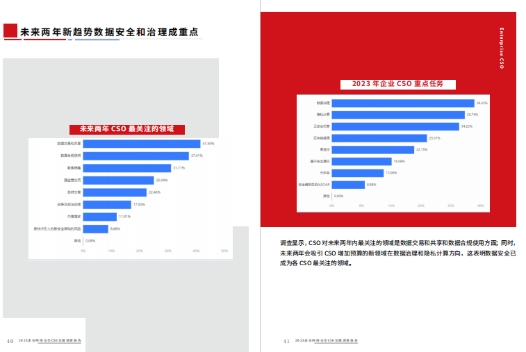 CSO对未来两年内最关注的领域是数据交易和共享和数据合规使用方面;同时,未来两年会吸引CSO增加预算的新领域在数据治理和隐私计算方向,这表明数据安全已成为各CSO最关注的领域。