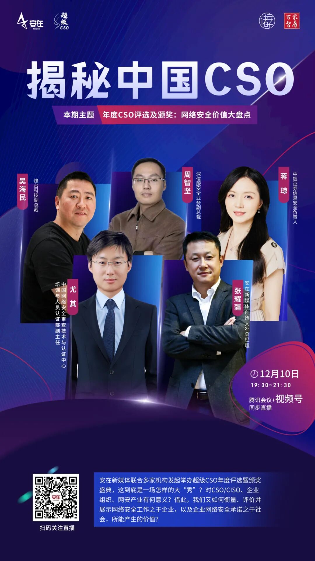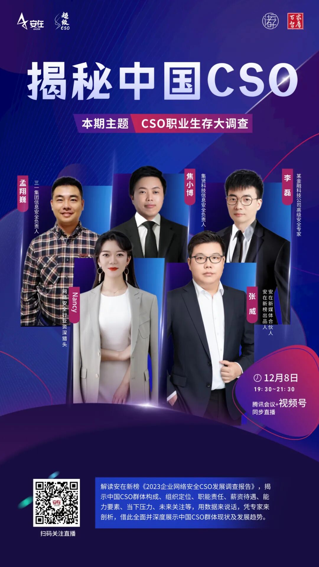 自2022年7月起,安在策划组织并持续举办了一系列线上圆桌形式的直播分享,初期围绕最新发布的《2022中国网络安全产品用户调查报告》,针对热点,专家对谈,一时间引起强烈反响。按照我们的计划,以“诸子安在 百家说事”为标签的系列直播,会一直延续下去,成为长期固定的视频栏目,而其所涉及的主题,会在不同时期有所不同。最新一辑共两期,围绕安在近期发布的《2023企业网络安全CSO发展调查报告》,以及2022超级CSO年度评选活动,与各界专家和大咖来一波“中国CSO大揭秘”。