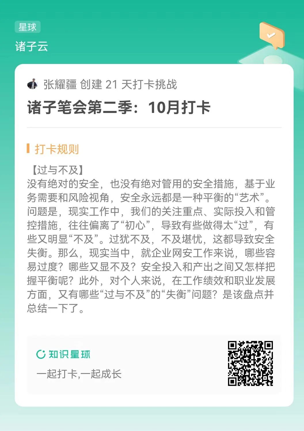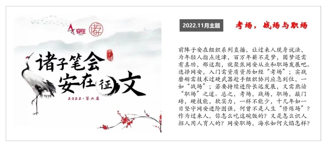 自2022年5月起,“诸子笔会第二季”正式拉开帷幕。经过对首届活动复盘,我们在坚持大原则、大框架、主体规则基础上,优化赛制特别是奖项设置和评奖方式。14位专家作者组成首批“笔友”,自拟每月主题,在诸子云知识星球做主题相关每日打卡,完成每月一篇原创。除了共同赢取10万元高额奖金,我们更要聚焦甲方关注,发掘最佳实践,弘扬分享精神,实现名利双收。本期发文,即诸子笔会2022.10月回顾及盘点。