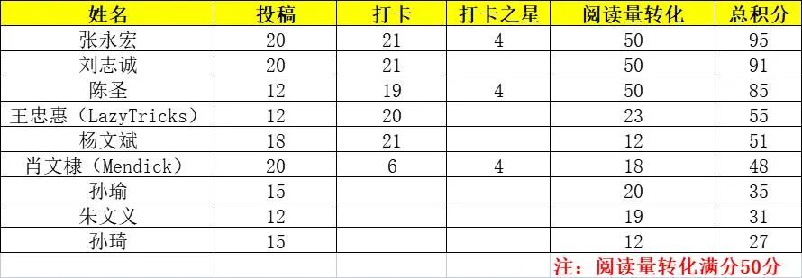 根据征文活动规则,综合每日打卡、投稿及文章阅读量折合积分后,现将参与者总积分表公示↓
