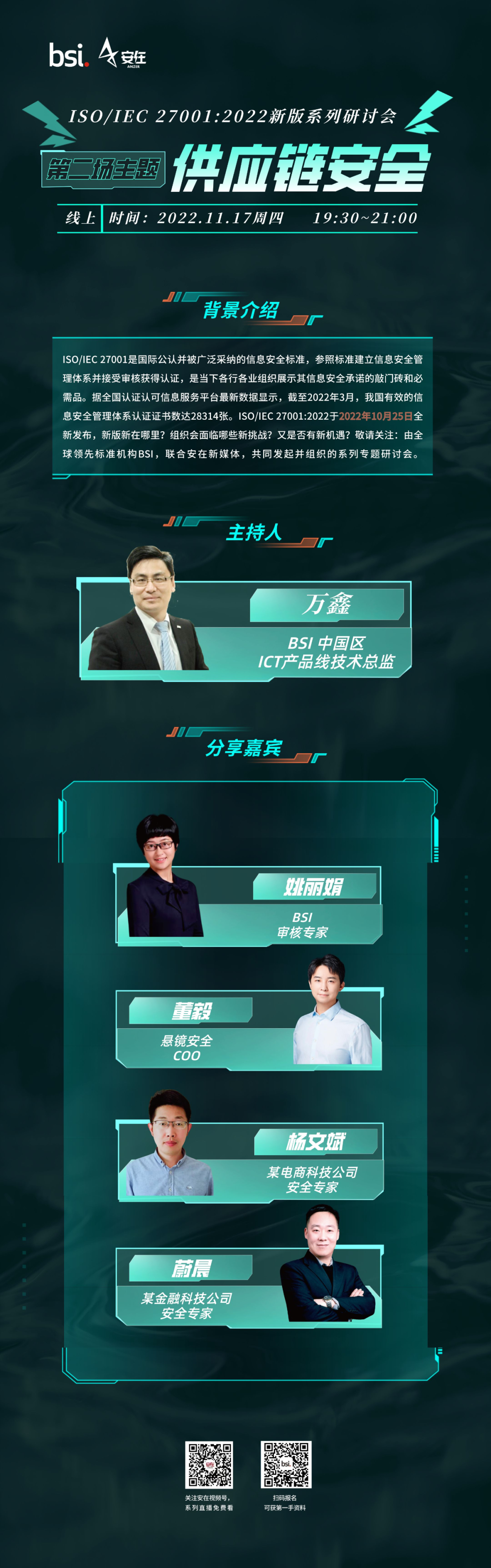 11月8日,BSI联合安在围绕新版ISO/IEC 27001举行系列专题研讨线上直播会,内容涵盖供应链安全、安全运营、数据安全等等,专题研讨直播活动将贯穿11月和12月,并将于12月召开线下交流会。