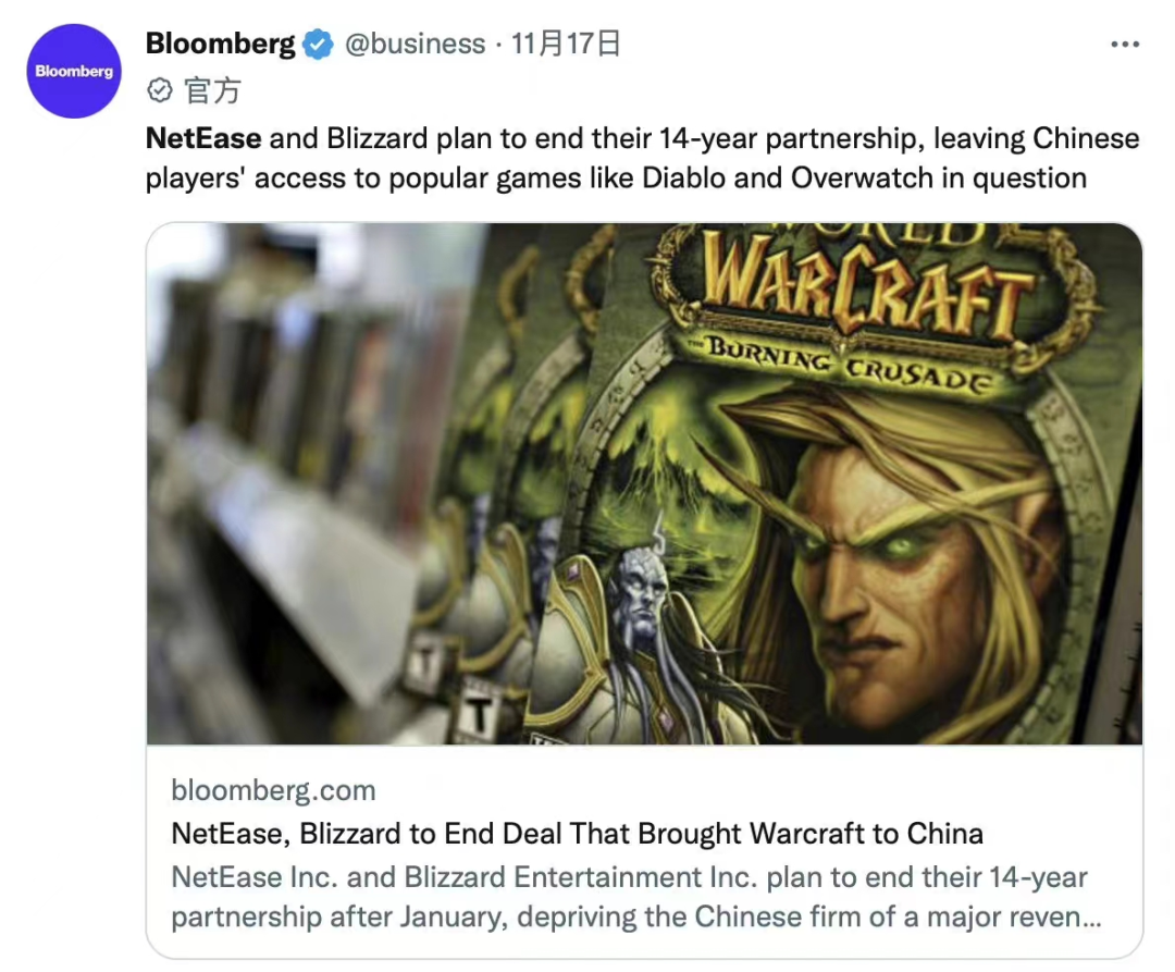 11月17日,暴雪娱乐发布声明称,由于同网易的现有授权协议将在2023年1月23日到期,届时将暂停在中国大陆的多数游戏服务。