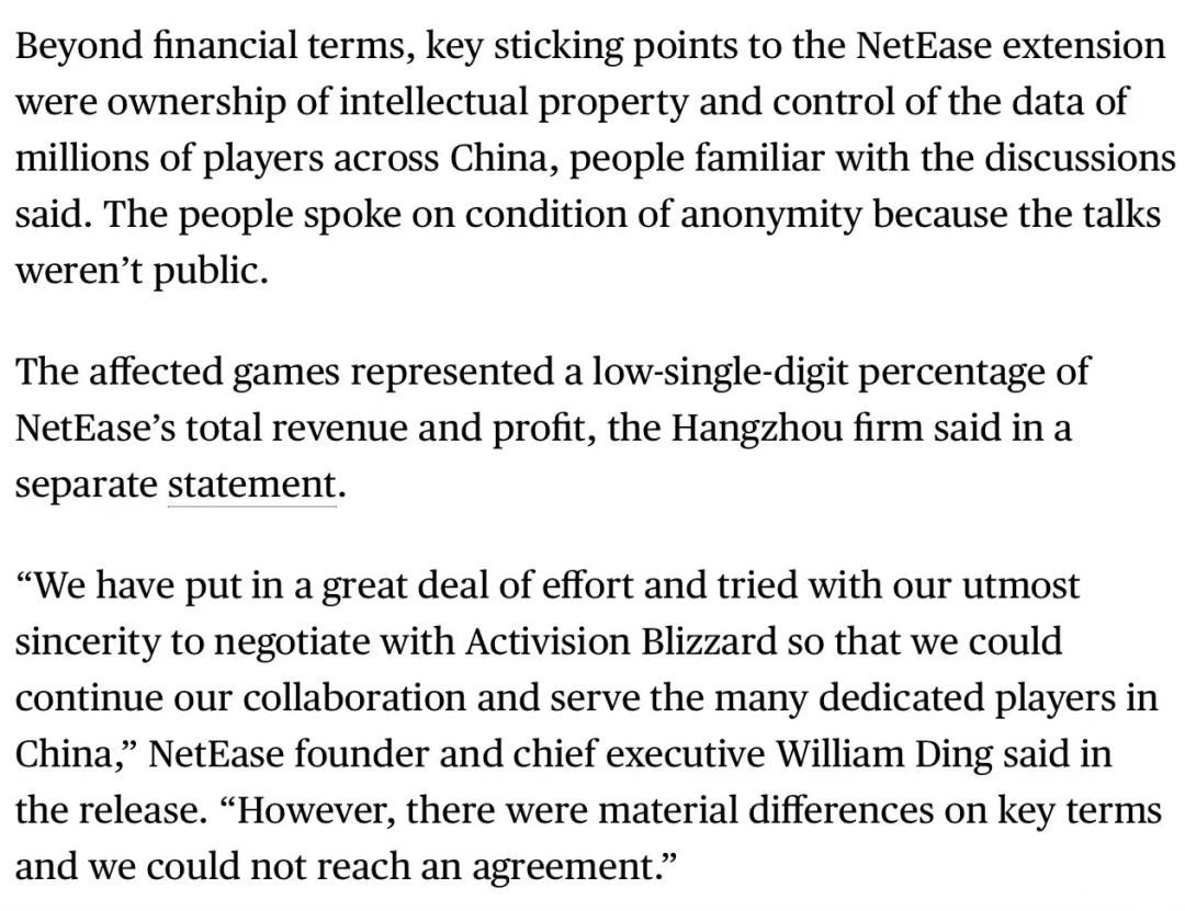 彭博社撰文报道暴雪网易终止合作称:据知情人士透露,除了财务条款之外,暴雪与网易终止合作的关键症结还在于"知识产权的所有权"和"对中国各地数百万玩家数据的控制"。也就是说,暴雪想要获取中国百万玩家的数据,也难怪丁磊在回应此事时特别提到了“保证玩家的信息安全和消费者权益”这部分内容。