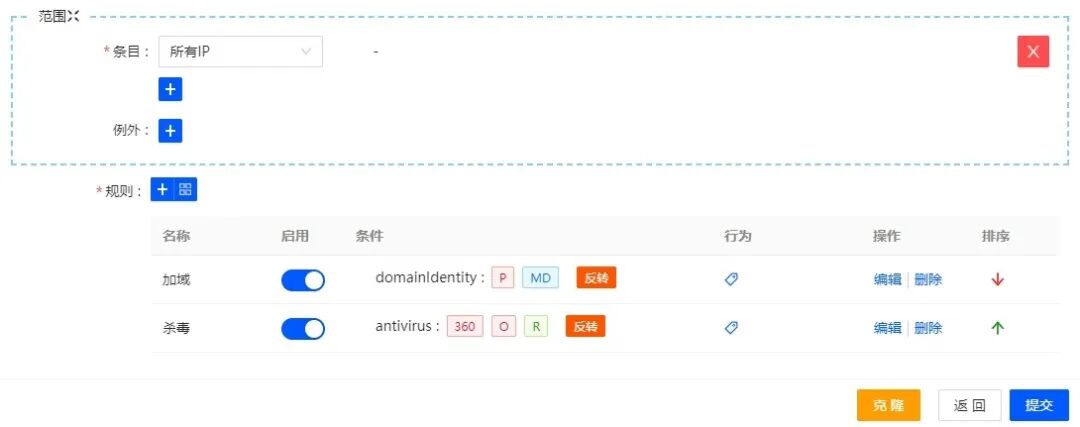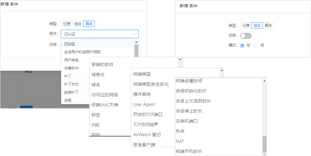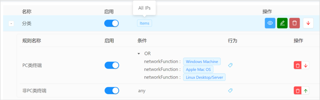 策略引擎管控的范围可以是网段、IP段、标签,“if”条件灵活自定义,可以任意、组合或具体条件,而行为则更加灵活多变,例如添加标签、应用虚拟防火墙、通知消息、网页通知、网页重定向、Portal认证、不合规踢下线CoA、审计联动......企业想实现的准入策略基本都包含在内。