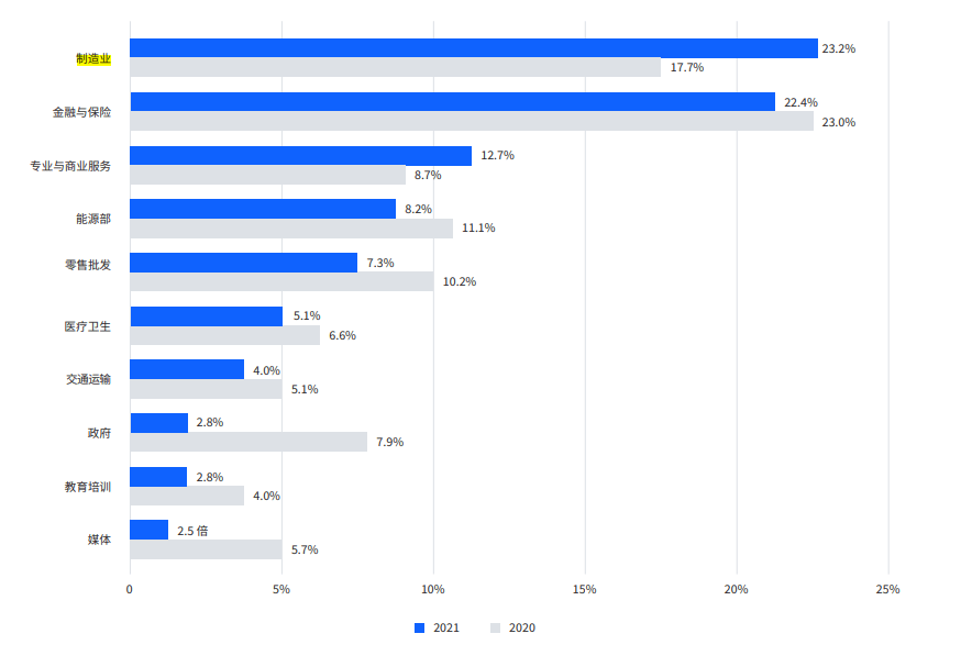 2021 年与 2020 年前 10 大行业遭受的攻击率(资料来源:IBM Security X-Force)