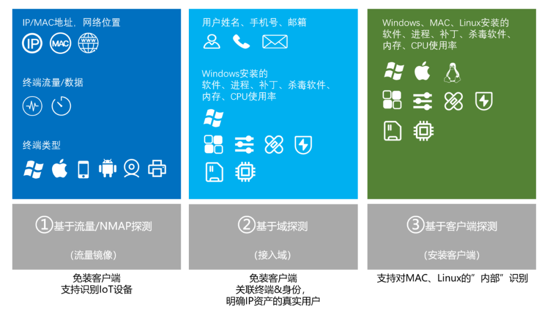 宁盾无客户端准入方案正是通过接入AD域,利用域探测的方式来检测 Windows 终端的合规性。而 IoT、BYOD终端,也可以免装客户端就能识别终端类型,利用流量镜像进行检测。对于Mac、Linux 终端,则可以基于轻量化客户端来探测终端的“内部”信息。