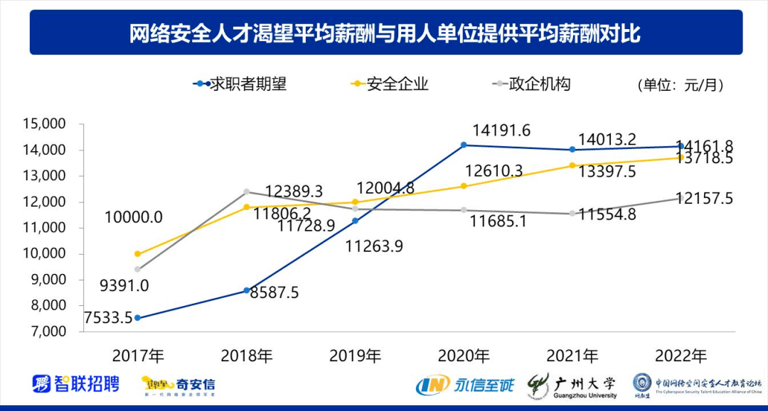 “2022 年求职者期望的平均薪酬约为 14161.8 元/月,较去年增加了 148.6 元/月。但今年求职者的期望薪酬依然要高于用人单位提供的平均薪酬,政企机构提供的网络安全相关岗位的平均薪酬约为 12157.5 元/月,安全企业提供给网络安全相关岗位的平均薪酬约为 13718.5 元/月。” 以上信息摘录自“网络安全人才市场状况调研报告-2022年”。