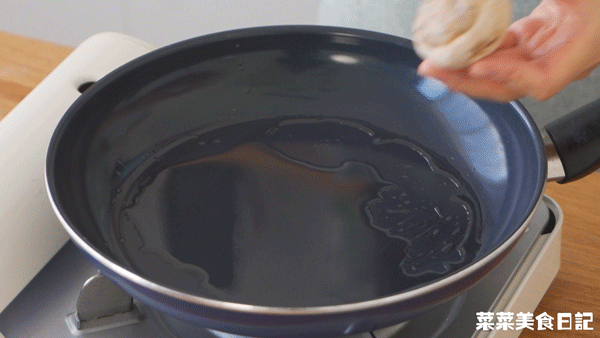 4.平底不粘锅内放少许油,虾滑面向下中小火煎至金黄,