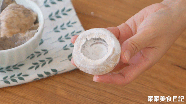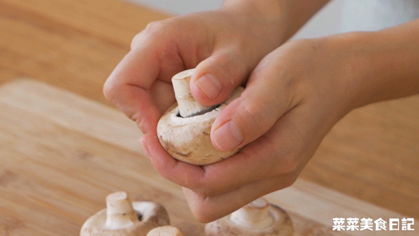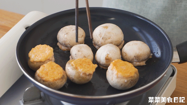 口蘑内抹上淀粉,能防止煎熟后馅料脱落~