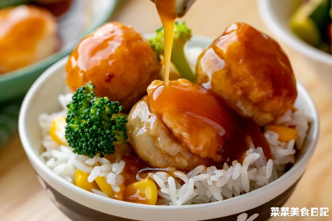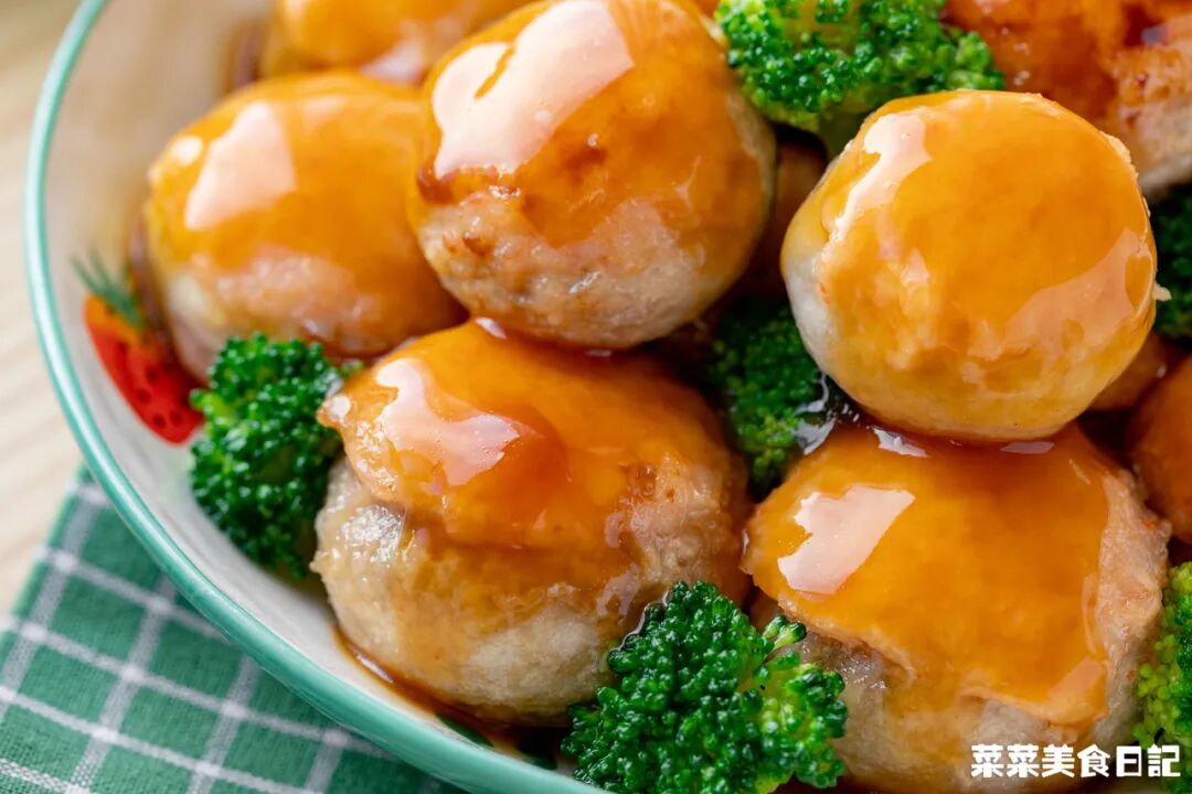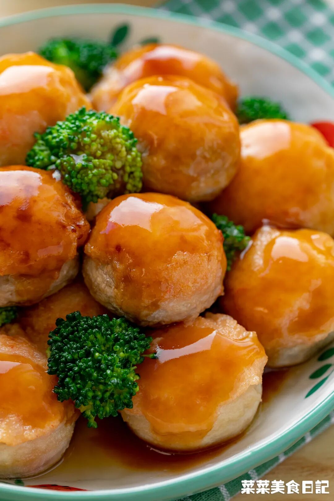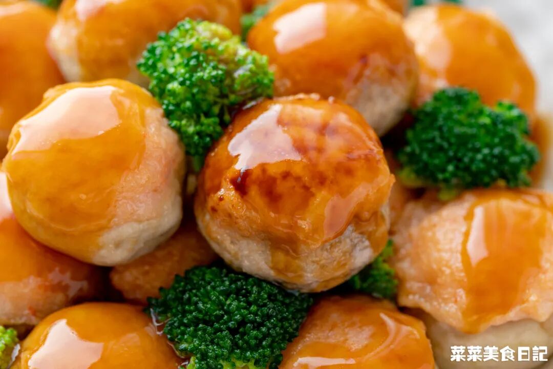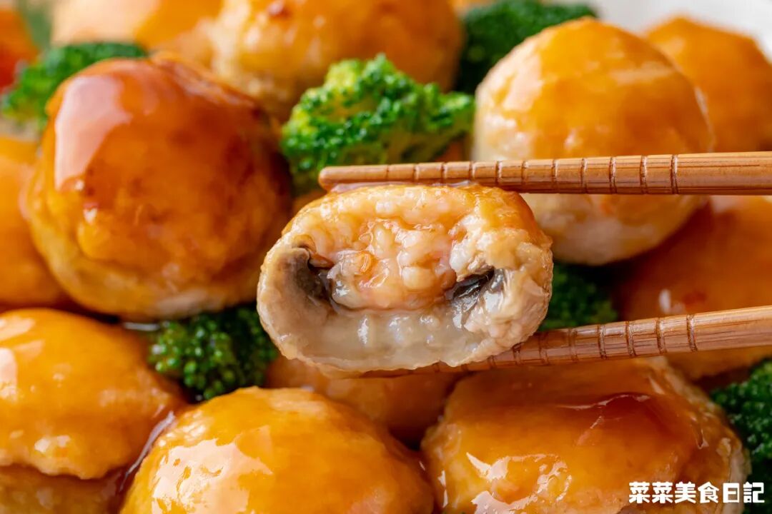 白色的口蘑和橘红的虾滑融为一体,裹上照烧汁后,边界模糊,像一个个圆滚滚的小丸子。