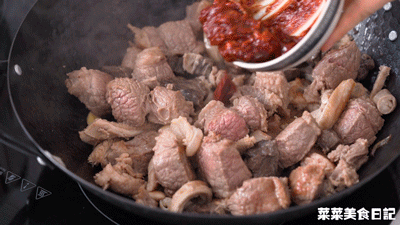 加入处理好的牛腩、炸过的料头、拌均的酱料翻炒均匀,锅边淋入10g米酒,小火炒2分钟炒出酱香味