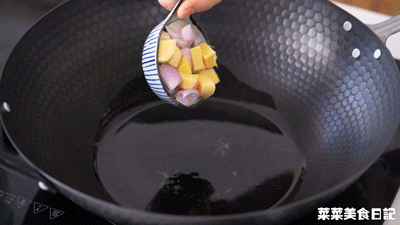 6.起锅放入50g花生油,烧至四成热,放入10g红葱头、10g蒜粒、30g姜粒小火慢炸2分钟,将料头炸香捞出,炸出香油过滤待用