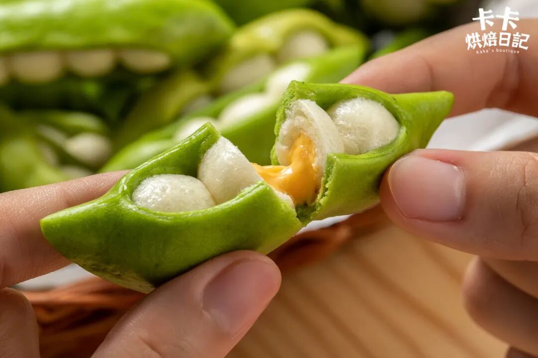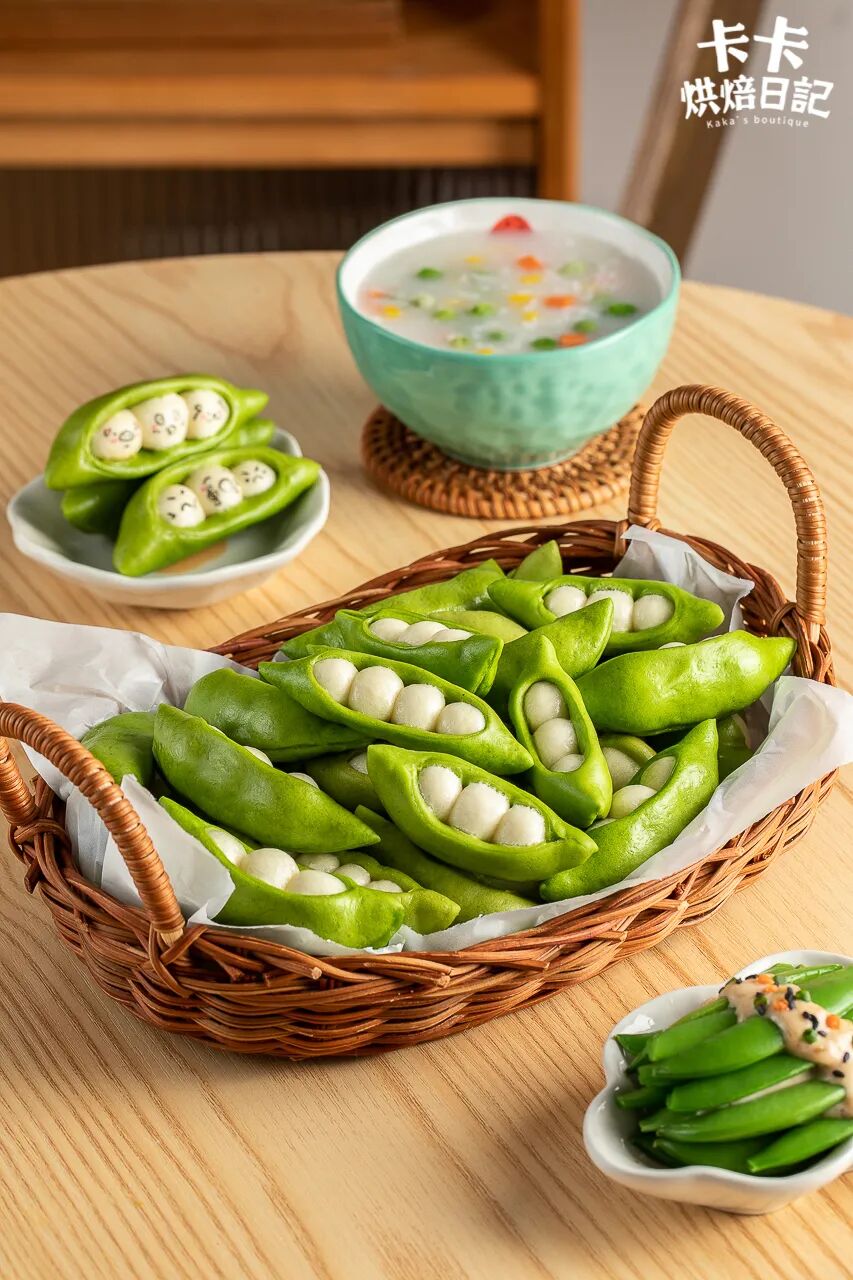 可别看到面食就摇头,这款蒸包,不用费力揉出手套膜、无需苦苦等待两次发酵。面一和、一发、一蒸就完事,比面包更柔软,好吃还不上火!蒸包口感柔软蓬松的秘诀,在于面团中加入了少量的小苏打粉。一上蒸锅,小苏打遇热,变得活力十足,开始使劲儿呼吸。释放出的二氧化碳,在面团中撑起无数个小气孔,面团从而膨胀、长大,变得鼓嘟嘟、软fufu。卡卡还在“小豆子”里头包了奶酪馅,用现成的芝士片就成,简单方便。造型手法也简单:白色的牛奶面团搓成小豆子,绿色的菠菜面团擀成豆荚皮子。别忘了在皮子中间压出月牙形的口,让小豆子能探出脑袋。捏出小猪小狗小乌龟、小花小草小山丘,开一场妙趣横生的面团运动会!1、锅中烧水煮沸,放入1g盐、200g菠菜叶烫软,捞出过凉水,降温后的菠菜叶用手挤干水分备用2、菠菜加入180g水打碎,再用纱布或滤网过滤出菠菜汁备用3、碗中加入300g中筋面粉、1g小苏打、3g酵母、10g细砂糖混匀,再加入菠菜汁揉成面团,松弛15分钟5、碗中加入200g中筋面粉、3g酵母、10g糖混匀,再加入120g牛奶揉成团6、绿色面团分成15g每个的小剂子,牛奶面团分成4g每个小剂子,奶酪片分成3g一小份备用8、绿色面团滚圆,擀成2-3mm的圆片,对叠用圆形模具切出一个月牙形,打开再包入3个白色面团9、蒸锅中把水微微加热至40℃左右,放入豌豆荚蒸包发酵至1.5倍大再将蒸锅重新加热至上汽,放入豌豆荚蒸包大火蒸8分钟即可咬一口,蓬松、柔软又细腻,奶香和麦香慢慢化开在嘴巴里。