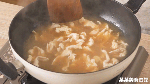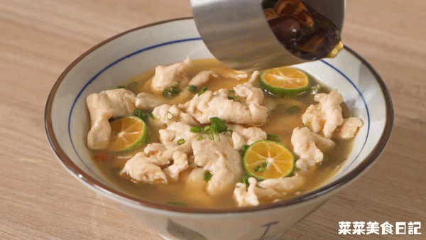 5.转小火放腌制好的鸡胸肉片,先不要翻动(以免脱浆),待鸡胸肉定型后用锅铲轻轻推动让它受热均匀,滑30~35秒左右,捞出放在蔬菜面上,倒入汤汁,放入青柠