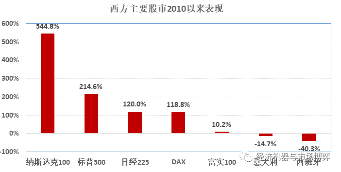 美国股市十年牛市,是国内专家“货币超发催生资产泡沫”观点的最主要依据。实际上,即使在美国内部,纳斯达克100和标普500之间差异巨大。过去十年,代表大型科技股的纳斯达克100指数在所有美国指数中涨幅最高,达到544.8%;而代表反映整个经济的标普500仅上涨214.6%,考虑到填补2008-2009年金融危机期间股市暴跌砸下的大坑,这个涨幅并不惊人。