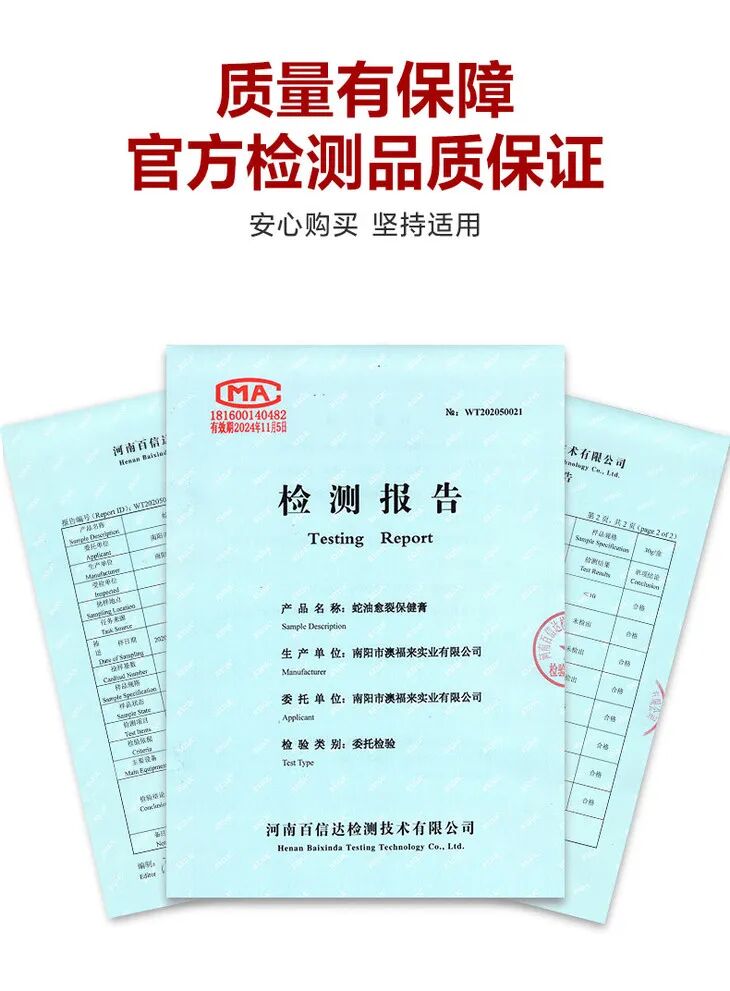 这款蛇油膏,没有添加有害化学试剂,成分健康不刺激,通过了国家相关质量机构的检测,老人,小孩,孕妇都能用。