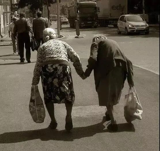 两个年岁已经很大的老奶奶,正牵着手慢慢地一步一步地往前走着。