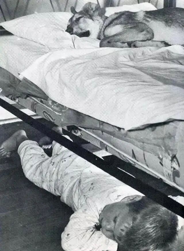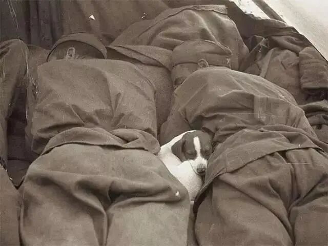 二战的战场上,两个士兵护着一只狗狗就这样安稳地睡着了。