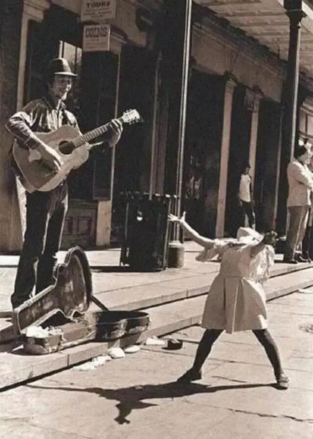 大街上,流浪的老爷爷拉着小提琴,路过的小孩跟着音乐,欢快地跳起了舞。