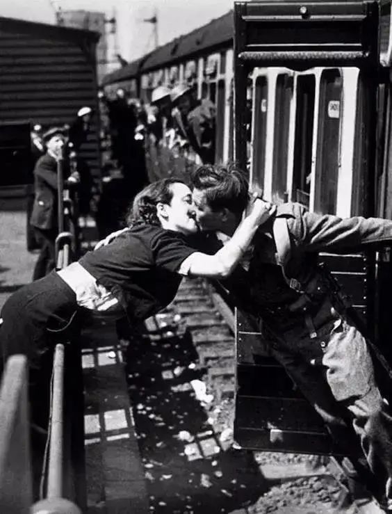 站台前,隔着很远的距离,姑娘奋力起身,吻到了久别的爱人。