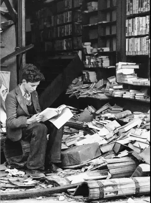 被炸毁的书店里,书籍散落了一地,一片狼藉里,一个少年正坐在那安安静静地看着一本书。