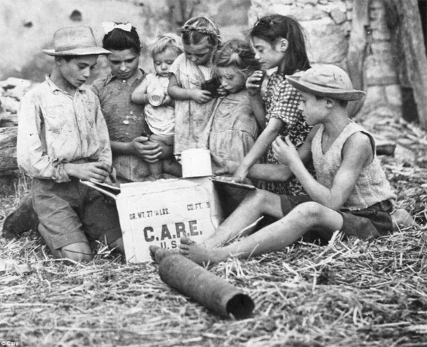 二战中,第一次收到新鞋的小男孩,抱着鞋子开心极了。他脚上的那双真的不能再穿了。