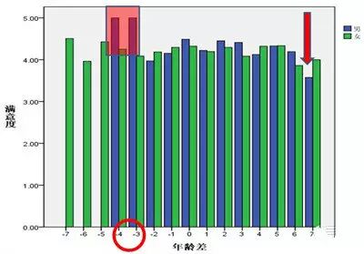 在婚姻家庭中,男性比妻子年龄小3、4岁的被访者,对伴侣的满意度达到峰值;相对地,男性年龄比女伴年龄大7岁时,满意度最低。