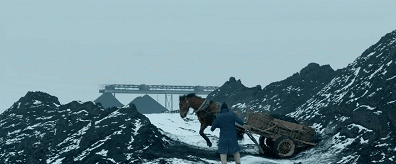 骡马已经不堪重负,甚至前腿蜷缩跪在了地上,马夫仍然一鞭一鞭的抽打,全然不顾马已经拉不动车的现实。
