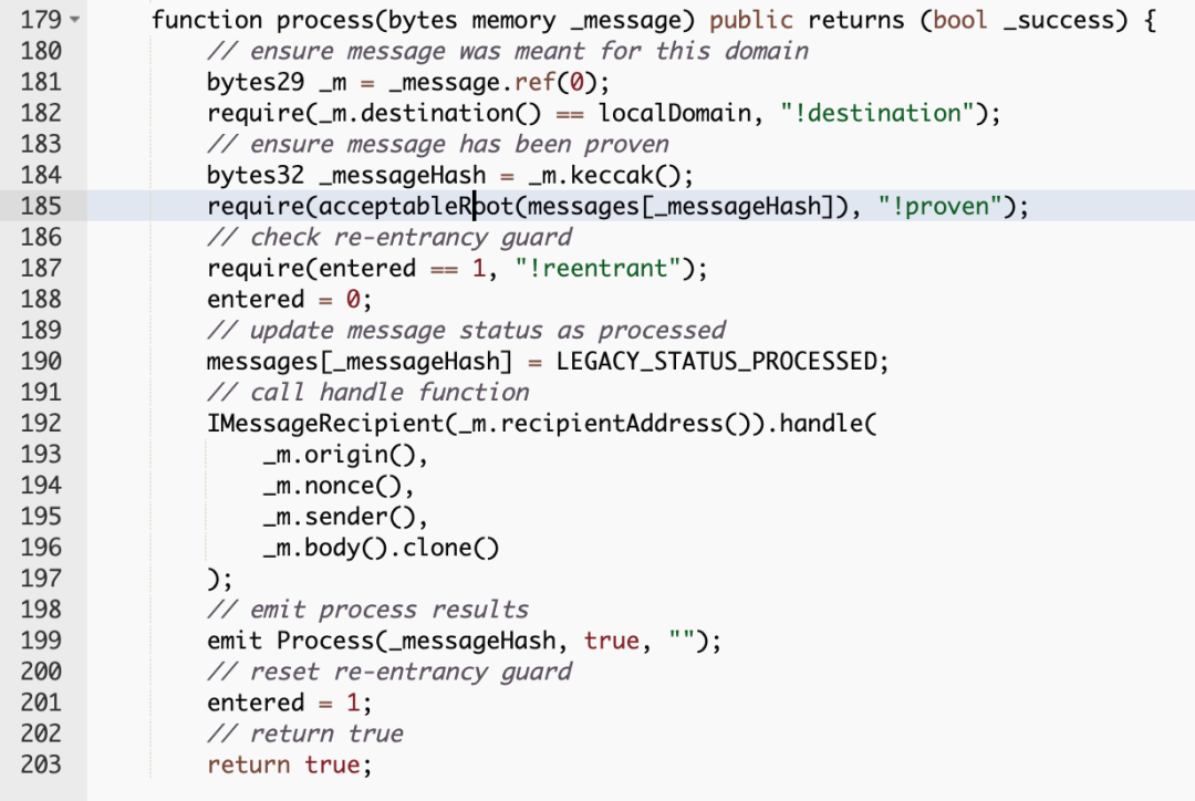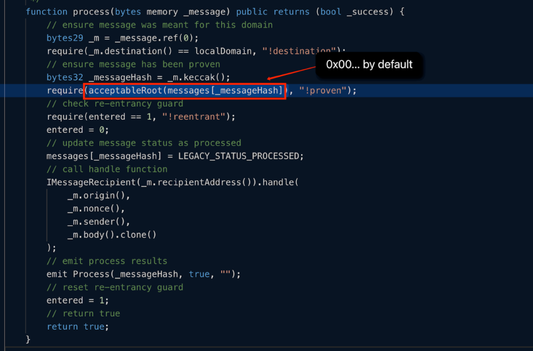 函数process通过调用函数acceptableRoot()确保message hash能通过验证。
