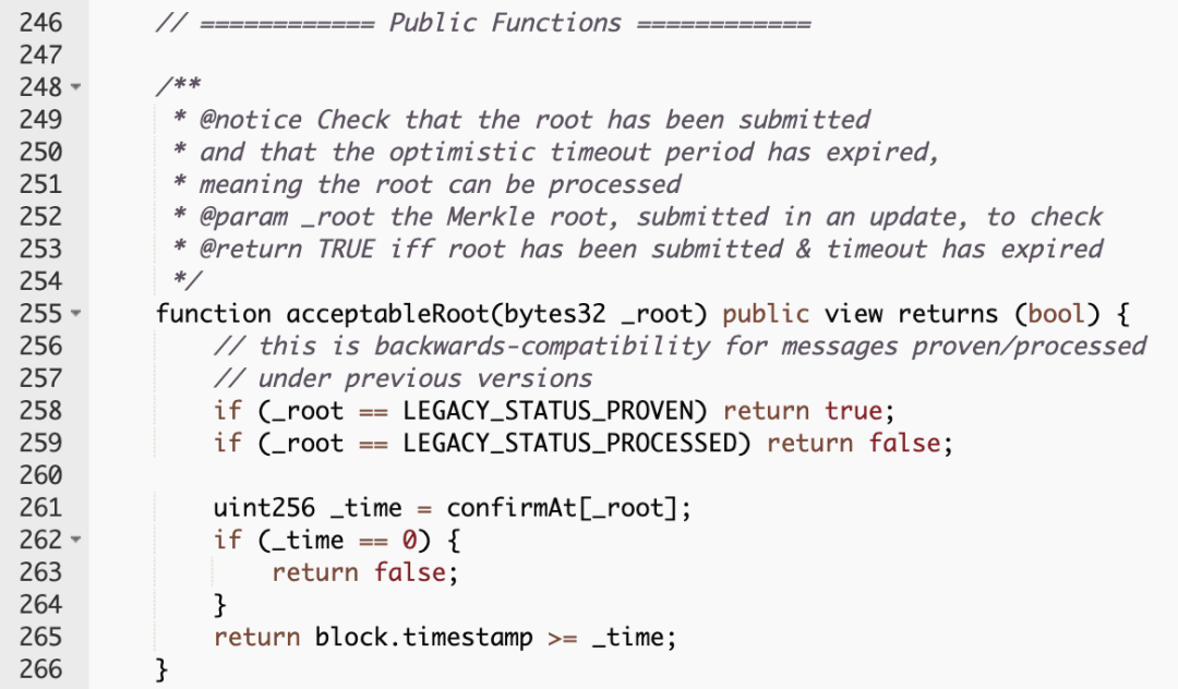 ② process()函数中调用了acceptableRoot(messages[_messageHash]),这个函数检查了被提交的root以及OptimisticTimeOut是否过期。