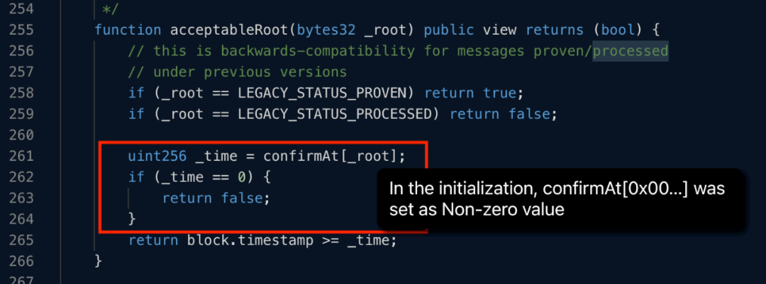 ③此时函数acceptableRoot(messages[_messageHash])返回了true,也就是说这条message就被批准了。这是因为0x0000在初始化过程中被设置为了true(CertiK安全专家认为这是部署过程中产生的错误)。