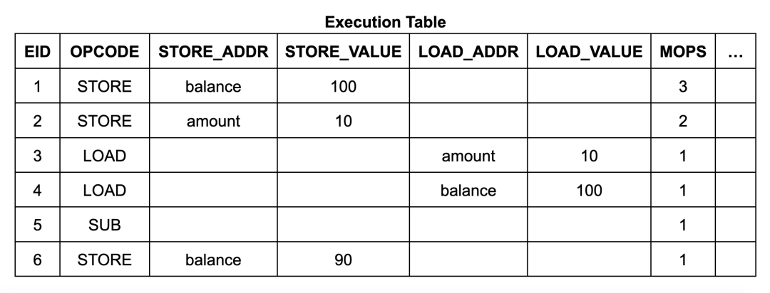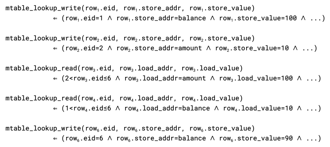 类似地,内存读取指令使用read_alloc函数实现。在上面的示例执行序列中,每条加载指令有一个读取约束,每条存储指令有一个写入约束,每个约束都由内存表中的一个条目所满足。