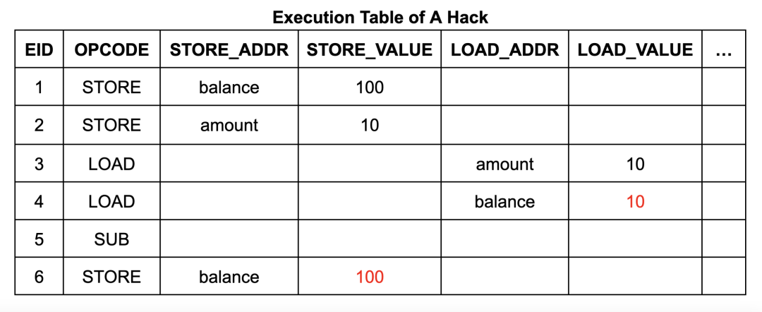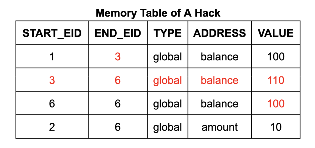 以提款程序为例,攻击者有机会在提款操作前,通过伪造一个$110的内存写入操作,将虚假数据注入到账户余额中。这一过程可以通过在内存表中添加一行数据,并修改内存表和执行表中现有单元格的数值来实现。这将导致其可以进行“免费”的提款操作,因为账户余额在操作后将仍然保持在$100。