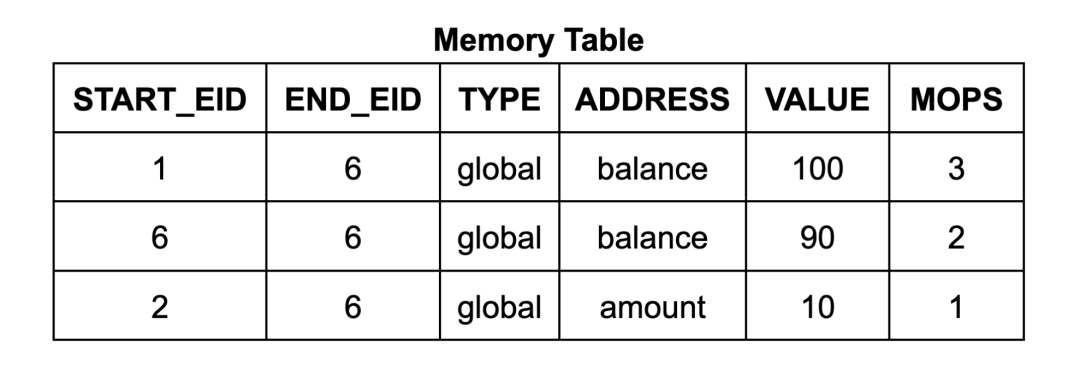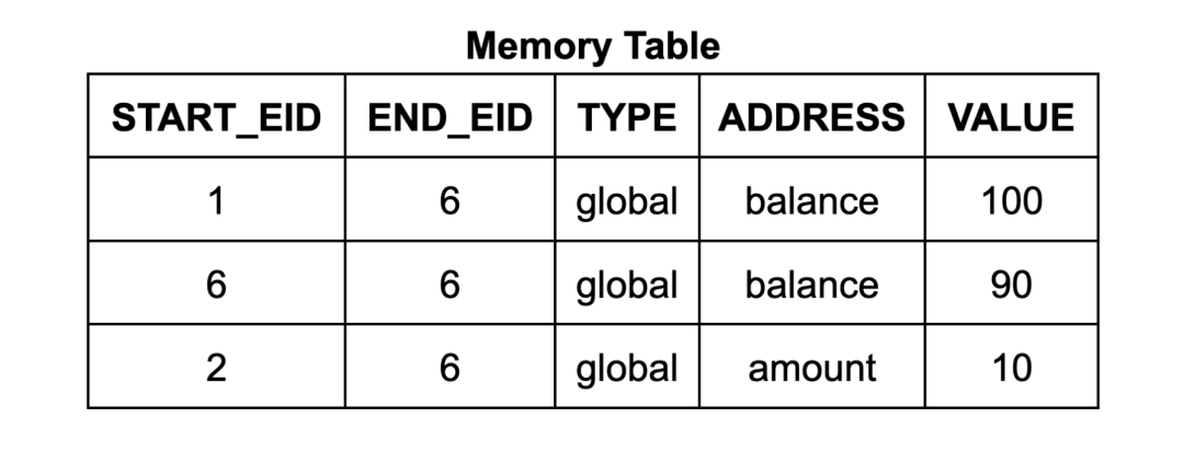 (memory_at(eid+1) type) = set (memory_at eid type) offset value这要求我们的验证比前述情况更精确。 仅仅从相等约束条件中得出内存表条目总数等于执行中的总内存写入次数并不足以完成验证。为了证明指令的正确性,我们需要知道每条指令对应了正确数目的内存表条目。例如,我们需要排除攻击者是否可能在执行序列中略去某条指令的内存表条目,并为另一条无关指令创建一个恶意的新内存表条目。