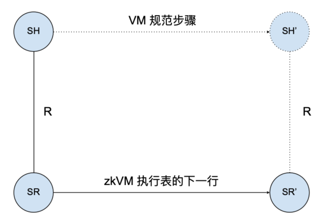 同样地,zkVM也有一个类似的正确性定理:zkWasm执行表中新的每一行都与一个基于该语言操作语义的合法步骤相对应。如下图所示,如果执行表中某行数据结构的当前状态是SR,且该状态在Wasm机器的高级规范中表示为状态SH,那么执行表的下一行状态SR'必须对应一个高级状态SH',且Wasm规范中规定了SH必须步进到SH'。