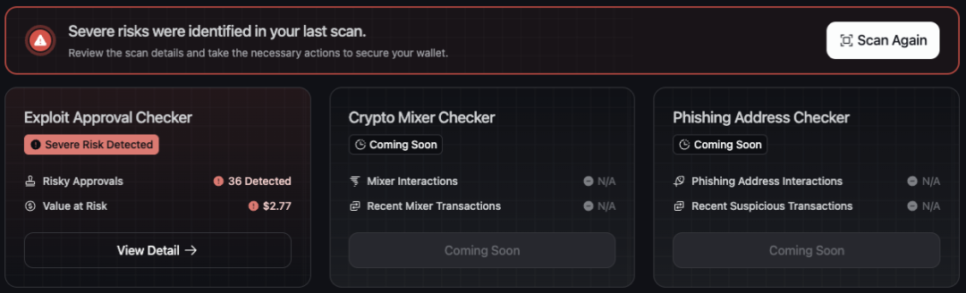 Wallet Scan也是一款旨在保护用户数字资产安全的工具。目前,它具备漏洞授权检查功能,能够扫描并识别高风险的钱包授权问题。随着未来“混币检查器”和“网络钓鱼地址检查器”等新功能的加入,Wallet Scan将为社区提供更全面的保护措施,帮助用户防范潜在的威胁,确保钱包安全。