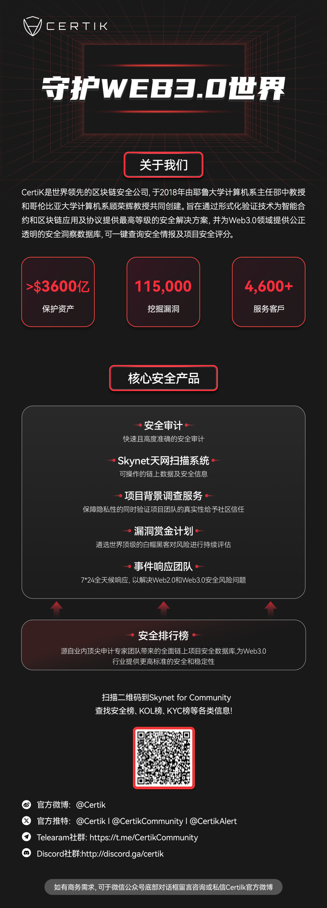 点击文末“阅读原文”即刻了解Skynet、体验安全工具。CertiK后续还将推出安全工具的使用指南,敬请期待!