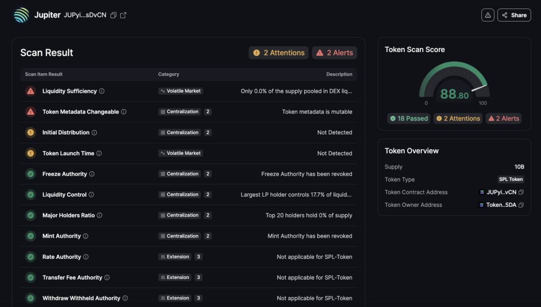Token Scan工具极大地方便了用户对代币安全性的评估。该工具最初是为Solana生态设计的,并且计划在不久的将来扩展支持以太坊和币安智能链(BSC)。它能够提供即时且深入的安全分析,尤其适用于那些在Solana上迅速推出的、尚未经过安全审计的Meme币。