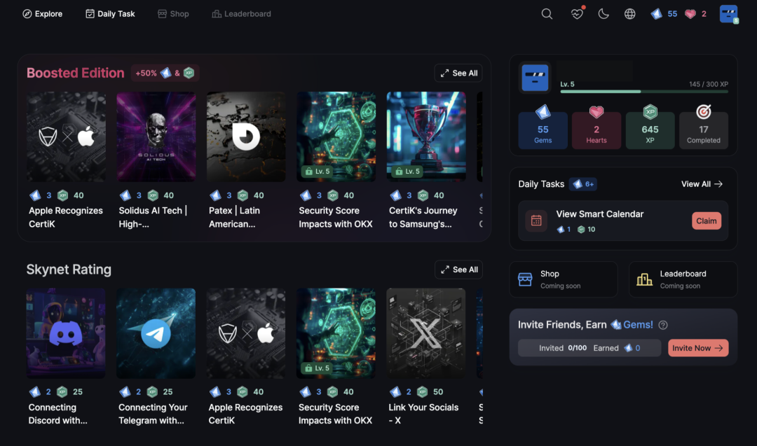 Skynet Quest是CertiK提供的一个创新性安全知识学习平台,它通过互动式学习模块,让社区成员在参与Web3.0安全主题学习的同时,不仅能够增加自身的安全知识,还有机会获得奖励。这种方式为Web3.0安全知识的学习增添了趣味性和动力,使得无论是新加入Web3.0的用户还是资深成员都能从中获益匪浅。通过完成与Web3安全相关的任务,用户可以更深入地理解Web3安全的重要性,并掌握保护自己数字资产的技能。