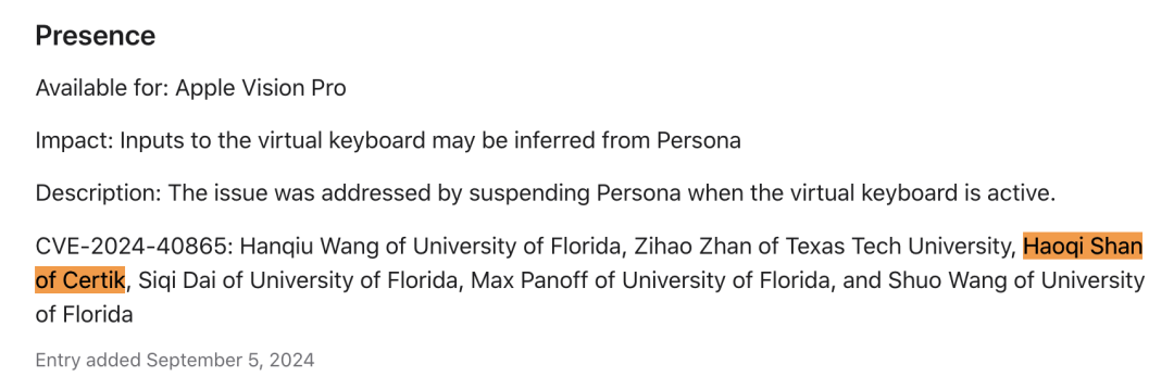 2024年9月20日,头部Web3.0安全机构CertiK自豪地宣布,CertiK的工程师因发现Apple Vision Pro MR(混合现实)头显设备中的关键漏洞而获得Apple公司认可,这已经是Apple公司第六次公开发布对CertiK的致谢,CertiK依旧是苹果公开感谢次数最多的Web3.0安全机构。