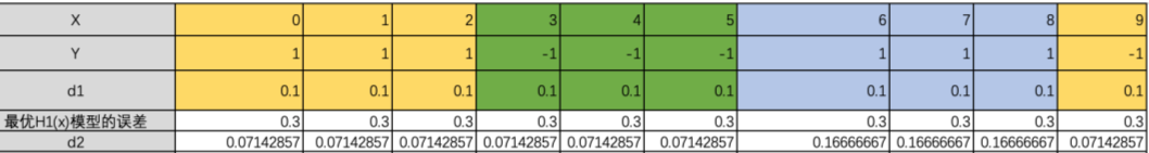 第二步,基于初始的样本权重d1(1/N=1/10)来计算出误差最小的模型,记住模型的误差等于误判X样本值的权重值之和。H1(x)误判了6,7,8对应的误差值=0.3;H2(x)误判了0,1,2,9对应的误差值=0.4;H3(x)误判了3,4,5对应的误差值=0.3;确定最有模型为H1(x)。