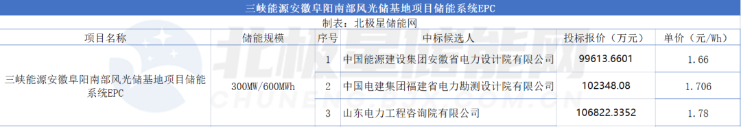 9月21日,三峡能源安徽阜阳南部风光储基地项目储能系统EPC总承包中标候选人公示。公告显示,第一中标候选人为中国能源建设集团安徽省电力设计院有限公司,投标报价99613.6601万元,投标单价为1.660元/Wh。第二中标候选人为中国电建集团福建省店里勘测设计院有限公司,投标报价102348.08万元,投标单价为1.706元/Wh。第三中标候选人为山东电力工程咨询院有限公司,投标报价106822.3352万元,投标单价为1.780元/Wh。