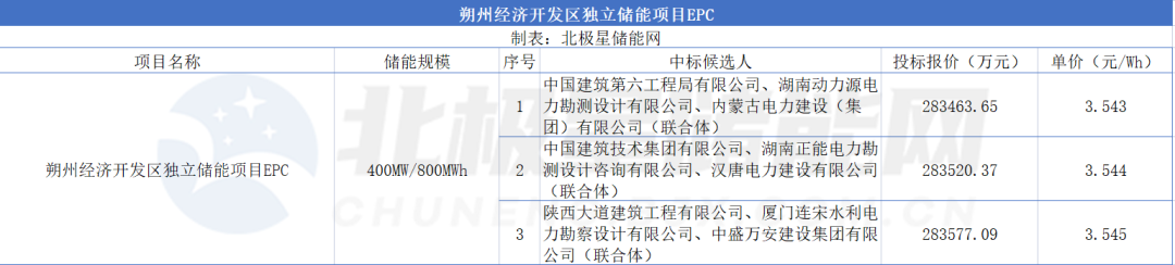公告显示,第一中标候选人为中国建筑第六工程局有限公司、湖南动力源电力勘测设计有限公司、内蒙古电力建设(集团)有限公司(联合体),投标报价28.346亿元,投标单价3.543元/Wh。第二中标候选人为中国建筑技术集团有限公司、湖南正能电力勘测设计咨询有限公司、汉唐电力建设有限公司(联合体),投标报价28.352亿元,投标单价3.544元/Wh。第三中标候选人为陕西大道建筑工程有限公司、厦门连宋水利电力勘察设计有限公司、中盛万安建设集团有限公司(联合体),投标报价28.357亿元,投标单价3.545元/Wh。