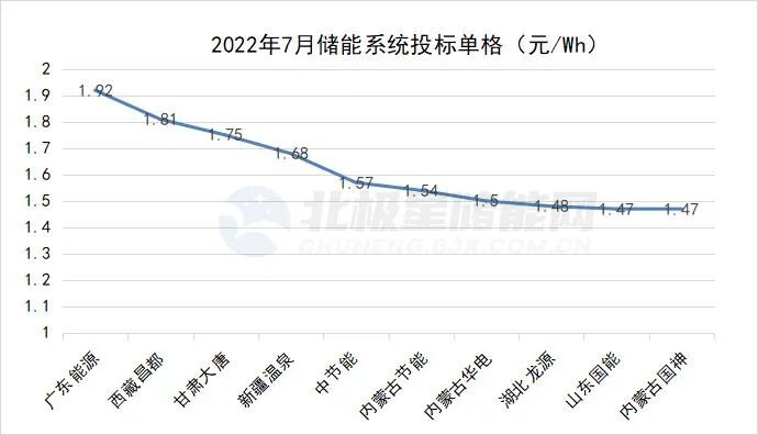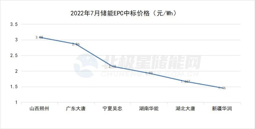 其中山西应县独立储能项目EPC招标中,湖北省电力勘测设计院有限公司、中国电建集团江西省水电工程局有限公司联合体投标报价3.07元/Wh,是七月份已知最高报价。