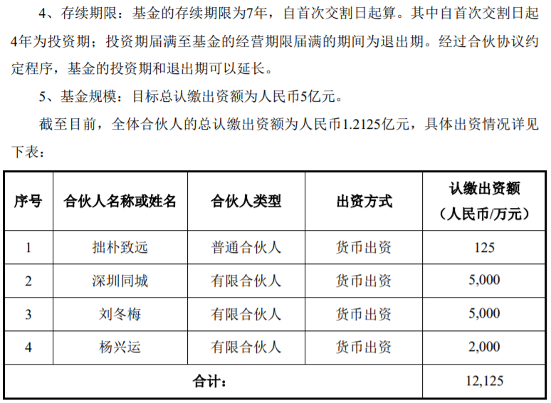 基金的目标规模为人民币5亿元,其中顺丰附属公司深圳同城拟出资5000万元或基金总认缴出资额的45%(以较低者为准)。截至目前,合伙人总出资额为1.2125亿元,其中顺丰参与出资5000万元。
